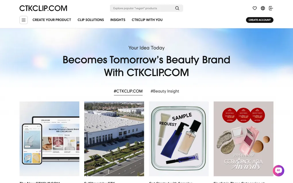 페이지를 열면 흰 배경에 하늘색 그라데이션 히어로 섹션이 펼쳐진다. “Your Idea Today / Becomes Tomorrow’s Beauty Brand With CTKCLIP.COM” — 영어 헤드라인이 중앙 정렬로 크게 자리를 잡는다. 한국 화장품 OEM/ODM 플랫폼이지만 글로벌 고객을 1순위로 상정한 구성이다.