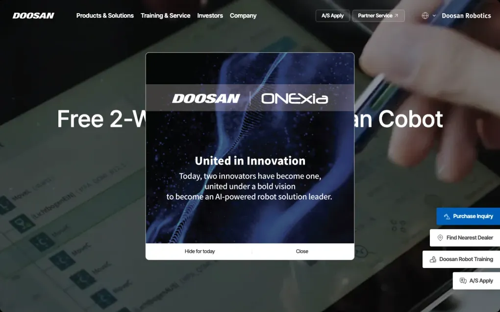 페이지에 진입하면 가장 먼저 눈에 들어오는 것은 Doosan × ONExia “United in Innovation” 팝업 모달이다. Doosan과 ONExia의 합병을 알리는 공지인데, 반투명 백드롭 위에 뜨는 이 모달이 히어로 영역의 첫인상을 상당 부분 가린다. “오늘 하루 보지 않기 / 닫기” 두 가지 선택지를 제공하는 전형적인 기업 공지 패턴이다.